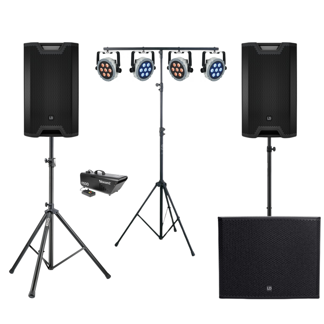 De LD Systems speakers zijn makkelijk aan te sluiten op je telefoon of laptop via Bluetooth of AUX. Met de rookmachine komen de 4 LED spots nog beter uit op uw feestje! Deze zijn bevestigd aan een lichtstatief zodat je zelf kan kiezen waar je hem neer zet en dus ook zelf kan bepalen hoe hoog u de spots zet. In de LED spots zit een automatisch licht programma waardoor je daar dus tijdens de avond niet meer naar om hoeft te kijken!