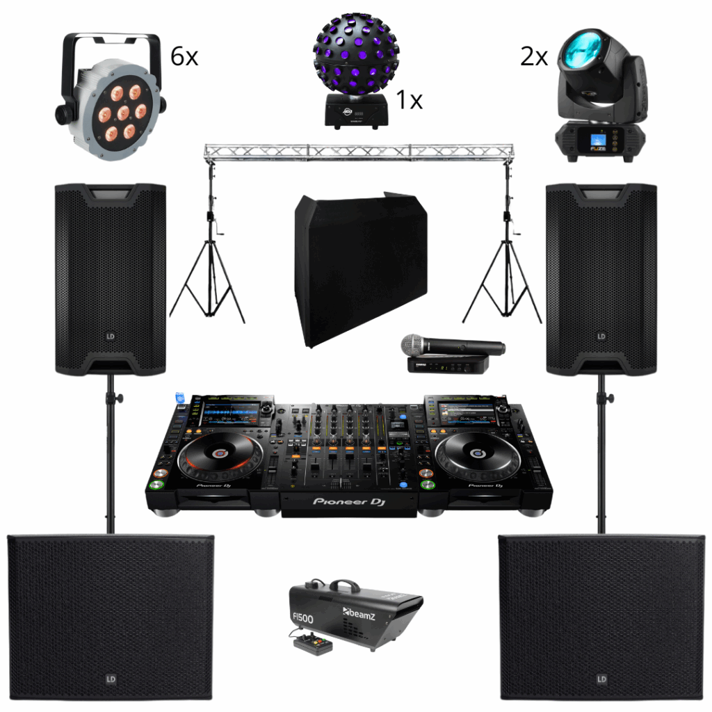 Een complete licht en geluid show voor uw feest. Alles word voor u geïnstalleerd, zodat u tijdens de avond nergens meer naar om hoeft te kijken en de DJ zijn eigen ding kan doen! Met natuurlijk een prachtige lichte show en kraakhelder geluid voor elke muziek genre dan ook!